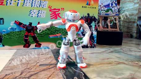 騎馬舞機器人,靈活的雙腳機器人,它能表演俯臥撐、仰臥起坐、前滾翻、后滾翻,表演節目:俏夕陽(舞蹈)、街舞、南非世界杯舞蹈;而最激動人心的還是火熱的江南style舞蹈,更有小朋友跟著舞蹈和機器人一起跳了起來。