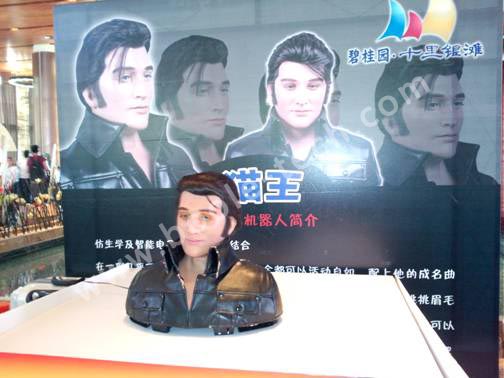 機器人貓王,這個智能防真機器 人更是將仿生學及智能電子控制真正完美的結合,很難另人想像,在一副幾乎可以亂真的面孔下,五官居然全都可以活動自如,配上他的成名曲,跟著音樂節拍,眼睛忽閃忽閃,時而注視你,時而望向遠方,挑挑眉毛,搖頭晃腦,仿佛一代巨星復活,給您開一場專場演唱會,再加上您可以為他量身打造各種造型,可當珍藏紀念,更可以接上你的手機,MP3,把他當成一個桌面人型音響,還可以接上MIC麥克風跟他一起高歌一曲,別有一番味道。