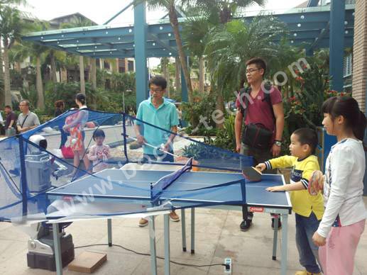乒乓球機器人,一款能自動發球的機器人,通過遙控控制,可調整發球的速度以及方向。適合孩子們練習乒乓球,現場慕名而來的孩子和家長都紛紛圍住,希望能體驗一下機器人打乒乓球有多厲害!