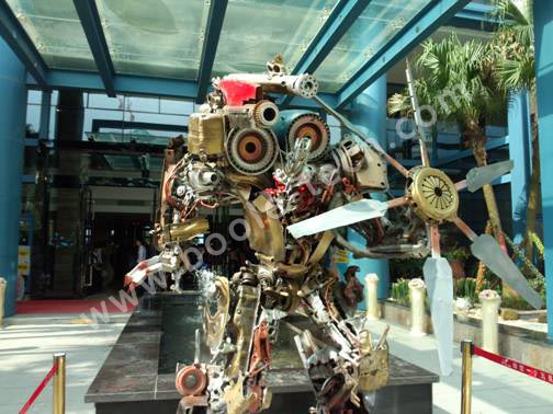 變形金剛“眩暈”,狂派角色,身高2米多,手部拿著一把直升機旋轉葉片,非常霸氣。為變形金剛配上距離感應裝置,當有人靠近變形金剛的時候,便會自動發出語音提醒,許多游客都紛紛停下腳步合影留念。