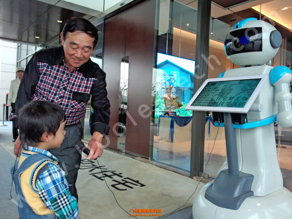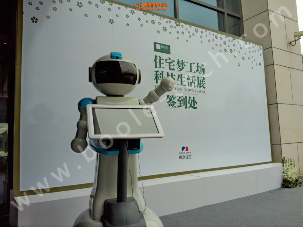 隨著游客們到來,迎賓機器人就會主動上前打招呼,問候大家。它的胸前有一塊觸摸屏,游客們可以通過屏幕與機器人互動,瀏覽房地產的相關介紹資料。