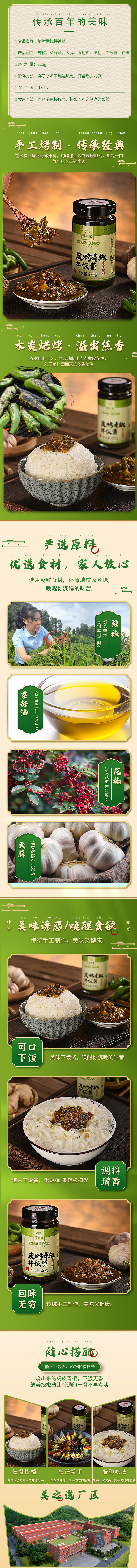 產品簡要:碳烤青椒醬 碳烤青椒醬采用純手工的碳烤方式,用貴州本特色鮮椒,大蒜,等用科學配方和現代工藝精制而成,香辣可口,是拌面和佐餐之佳品,其中含有維生素、辣椒素、蛋白質、礦物質等較高營養成分,具有獨特地方風味的佐餐調味品,是居家旅游的方便佳品。